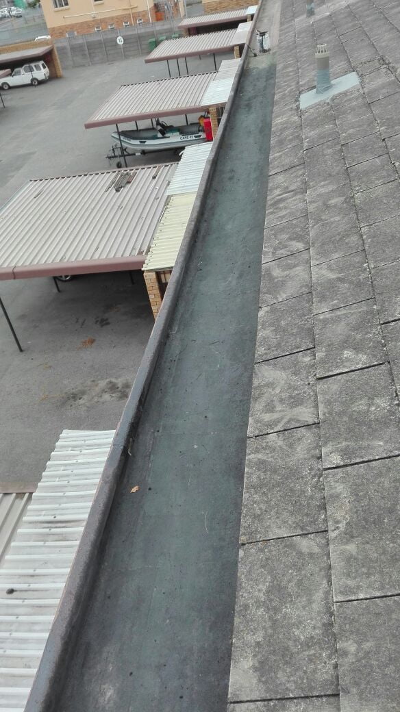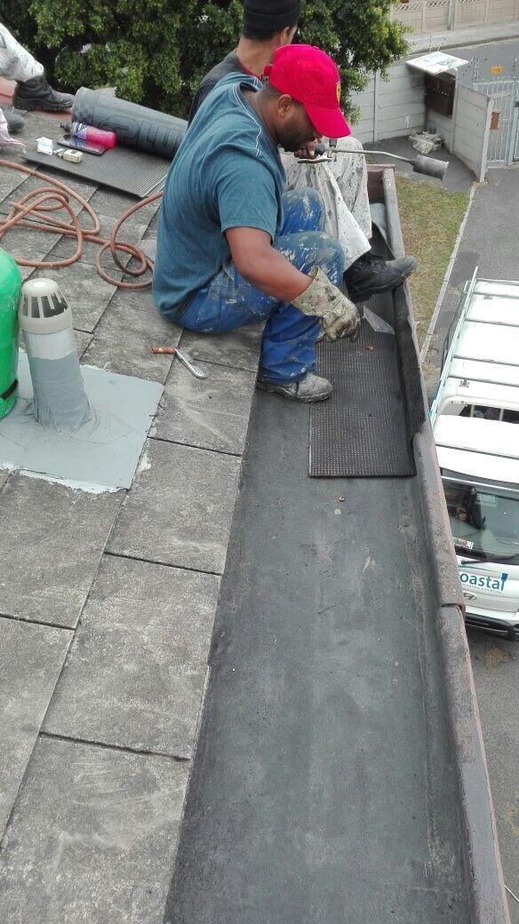 Today our team is waterproofing a 240m long box gutter for clients in Bellville. First they cleaned out the gutter and removed the failed waterproofing system. After priming the gutter, they waterproofed it with 4mm torch-on to ensure no more leaks occur. They will add counter flashings, as well as Silvercoat to protect the torch-on from the UV rays of the sun. This will ensure their gutter is well protected from the harsh elements, so it can serve its purpose for many years to come.